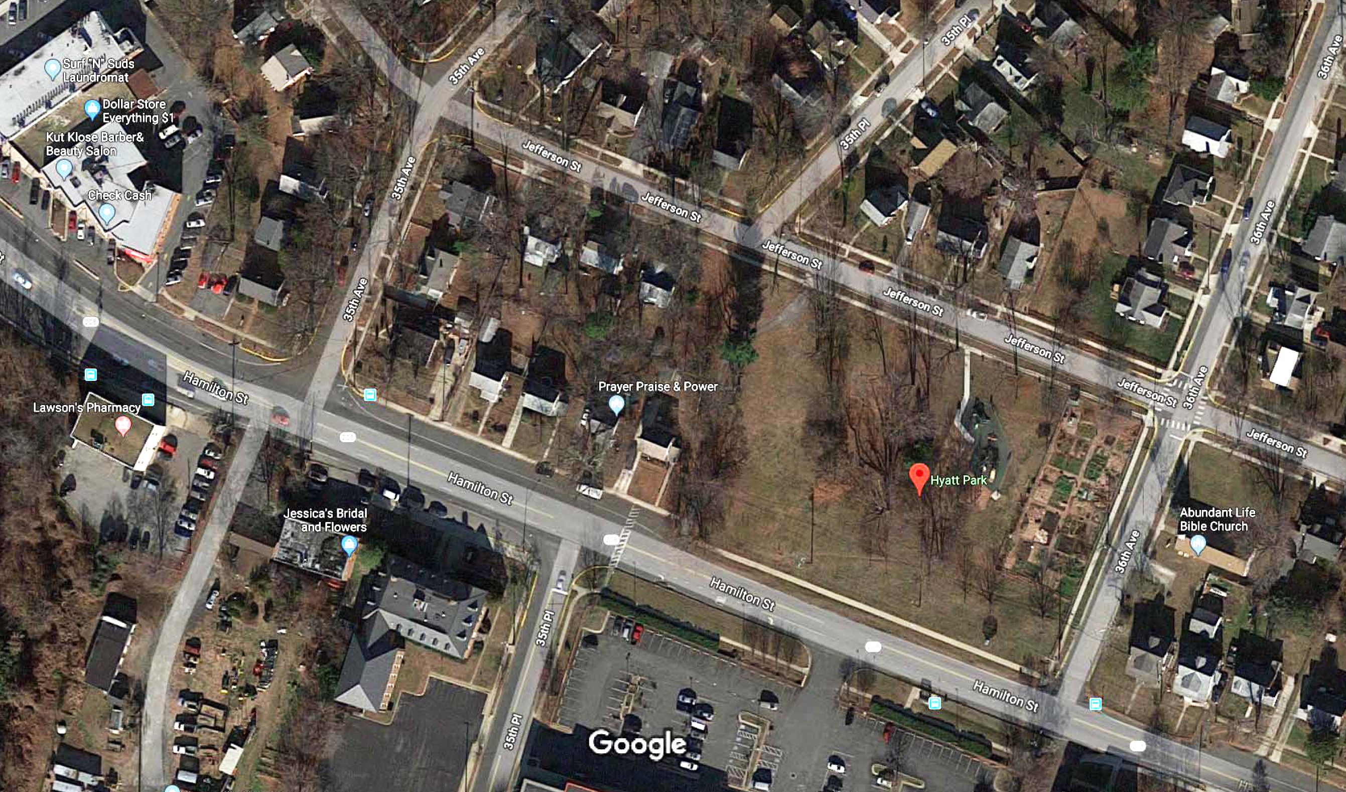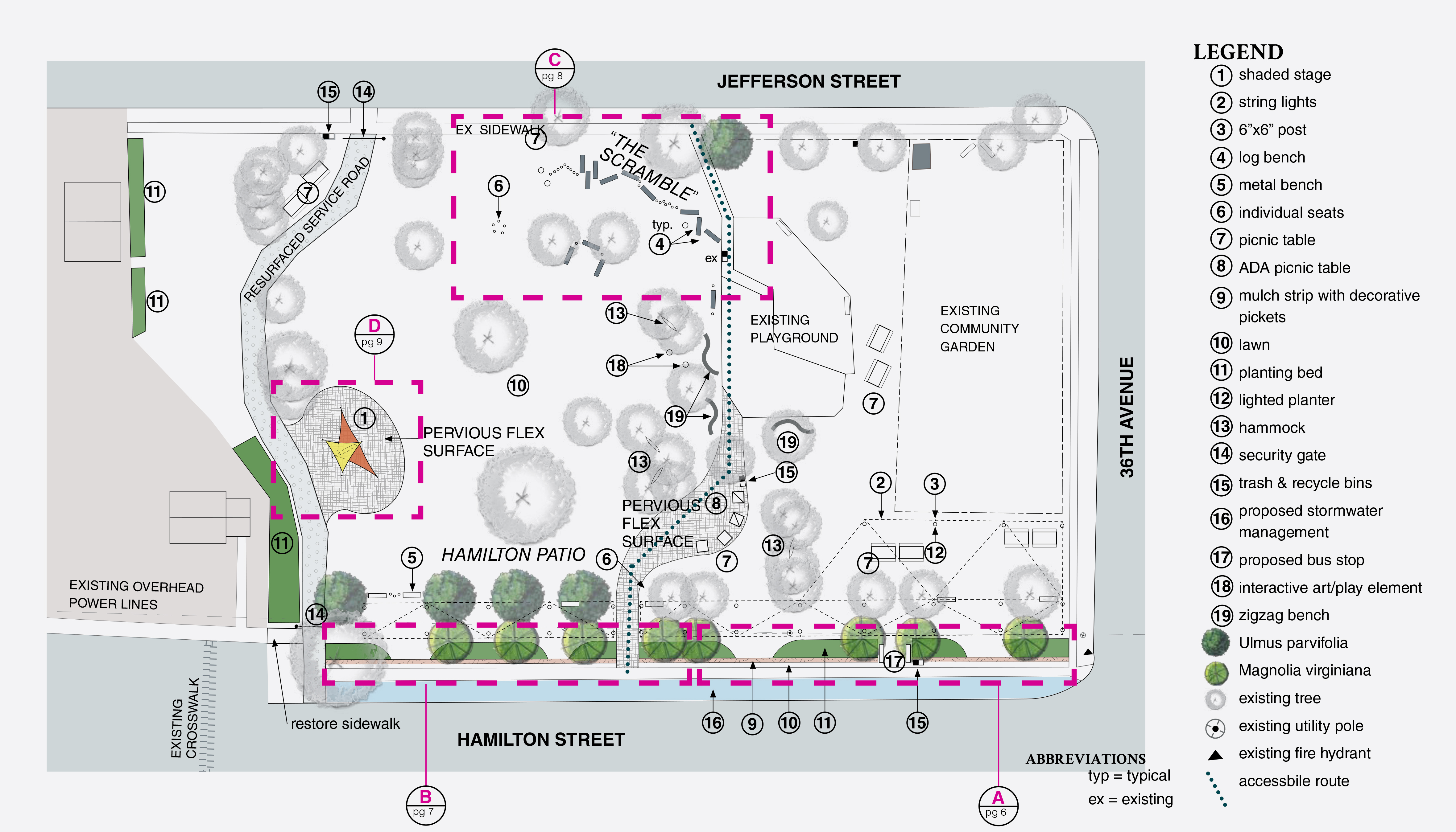 The output of our engagement work was this design by staff members Allie O’Neil and Laura Kendrick featuring a tree allée and lighted walk along the Hamilton Street border, a multi-use outdoor stage, and new play equipment and seating.