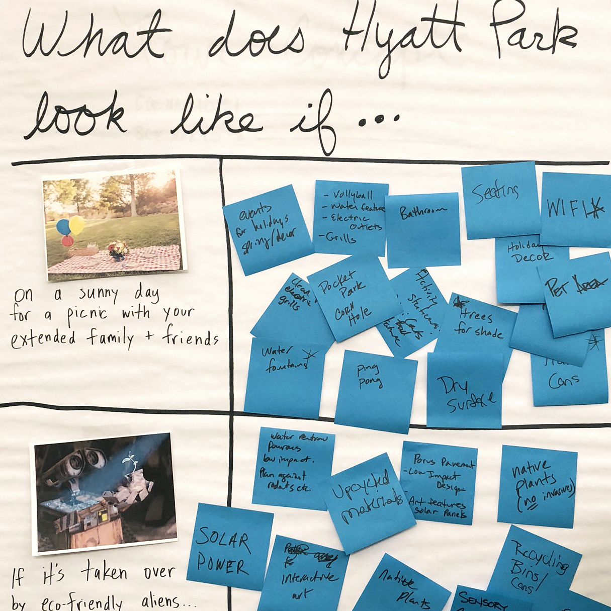 One of our main goals with the project was to challenge the City to explore new possibilities. We accomplished this by leaving behind the age-old charette, instead favoring fun, creative activities, designed by our staff, such as a ‘dating profile’ and pairing a realistic scenario with a fantastical one to spur imagination.