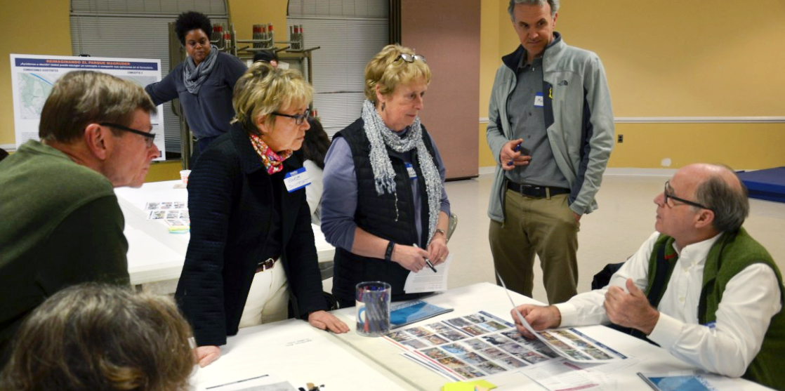 Hyattsville as a whole is roughly 33% African American, 31% White, and 34% Latino, and 57% of park users we surveyed identified as Latino. It was abundantly clear that any equitable engagement strategy needed to have native Spanish speakers on the team. NDC partnered with the Rivera Group, a D.C. based multilingual outreach and Spanish language translation organization, who provided real time interpretation at meetings, conducted on-site surveys, and facilitated focus groups and outreach with Spanish-speaking neighbors.