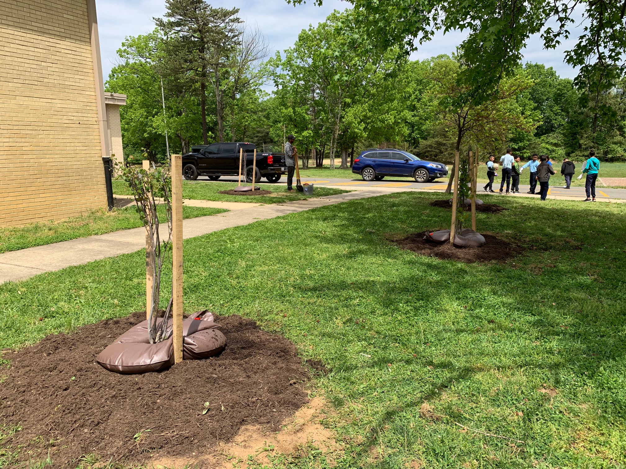 With the help of 24 second-grade students, Laura and I planted four Eastern Redbud trees. The project organizer was school counselor, Nakia Bethel Carter. We began with a brief presentation and introduction, explaining the work NDC as well as why trees are beneficial. We then split the students into groups of five to six, equipped with hand shovels and rakes. Each team of students planted their own tree by: (1) Digging a hole large enough for the new sapling, (2) preparing the hole for the tree by adding a mixture of soil conditioner and some of the old soil, (3) positioning a sapling in the hole while others filled the remainder of the hole, before tamping the ground with our feet, (4) covering the ground around the tree with a layer of mulch, and (5) placing a refillable water bag around the base of the tree for easy watering.