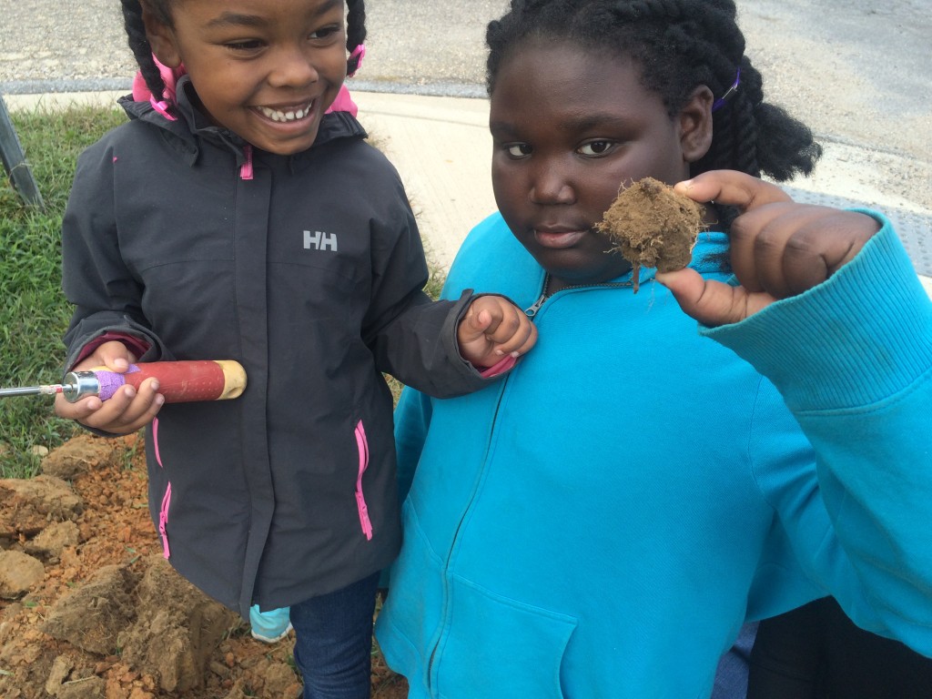 NDC created a design drawing and physically labeled the site (with temporary paint) to assist the volunteer team in planting their new trees and shrubs. The volunteer team was lead by Tia Holmes and members of the Prince George’s County Young Democrats. At our initial project kickoff meeting, we found out that Ms. Holmes actually attended Glassmanor Elementary school and that she was looking forward to creating an inspiring and healthy environment for future students. A fun and dirty time was had by all!