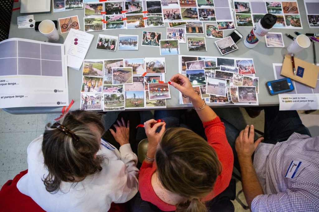 20 community members participated in the morning activities, led by NDC’ers Rachel McNamara and Marita Roos. Nearly everyone lived within walking distance of the park. The morning’s icebreaker, “Postcards from the Future,” gave people a chance to freely dream their vision for the future park in a message to a loved one – often enhanced with a colorful and highly personal design. The rest of the morning was spend choosing from a set of images to identify the park character and a set of priorities for the landscape. Nature, trees, and pollinator plants were on virtually everyone’s list. Play spaces for children and quiet areas for adults to relax were also favorites. Importantly, many people noted that they did not want lined sports fields with active sports. Informal, beautiful and accessible space seemed to be on most people’s wish list.