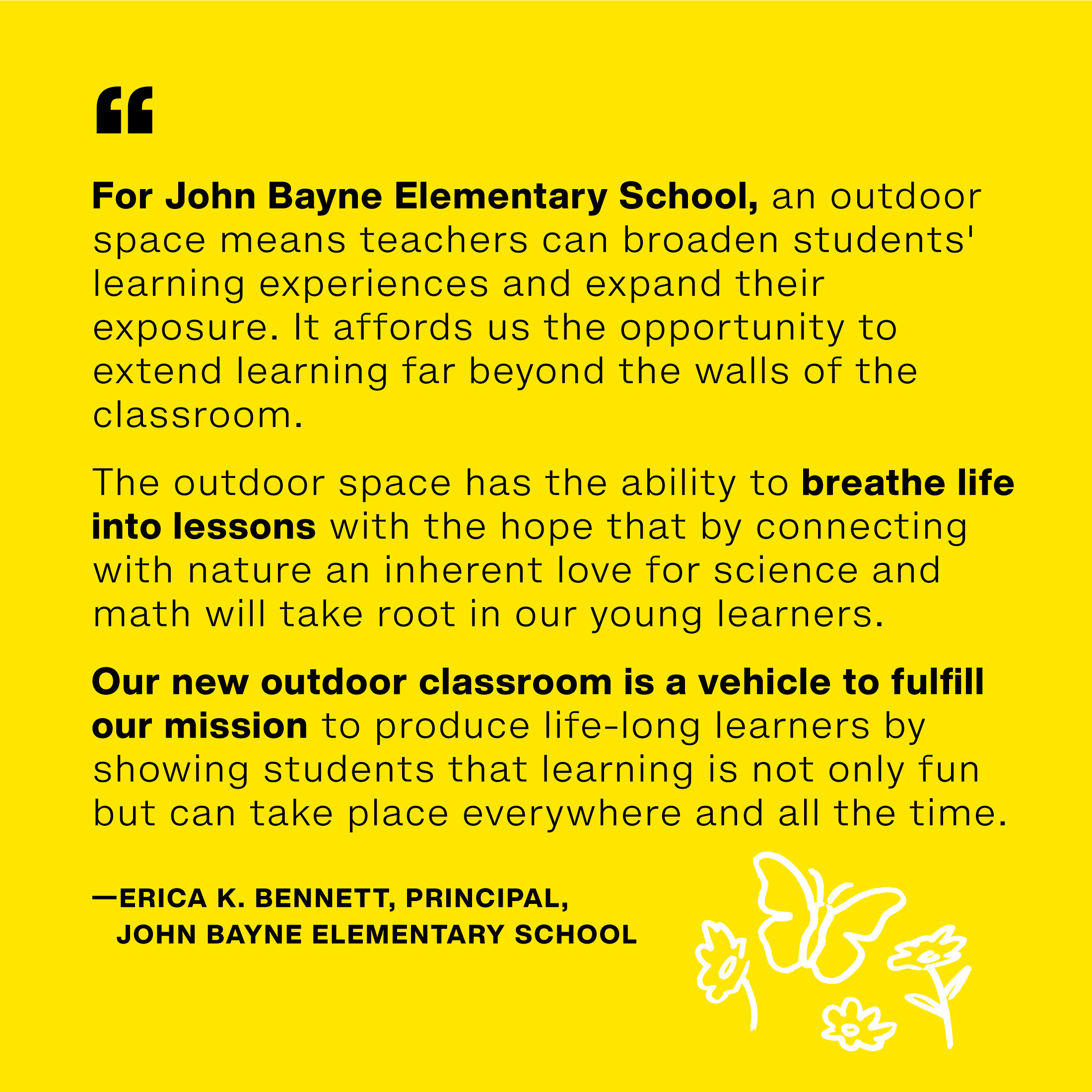 We know that when school reopens, John Bayne Elementary School students and educators will be thrilled with this new, flexible outdoor education space, which will be an invaluable asset to their campus. We look forward to designing more outdoor classrooms for the next cohort of schools.