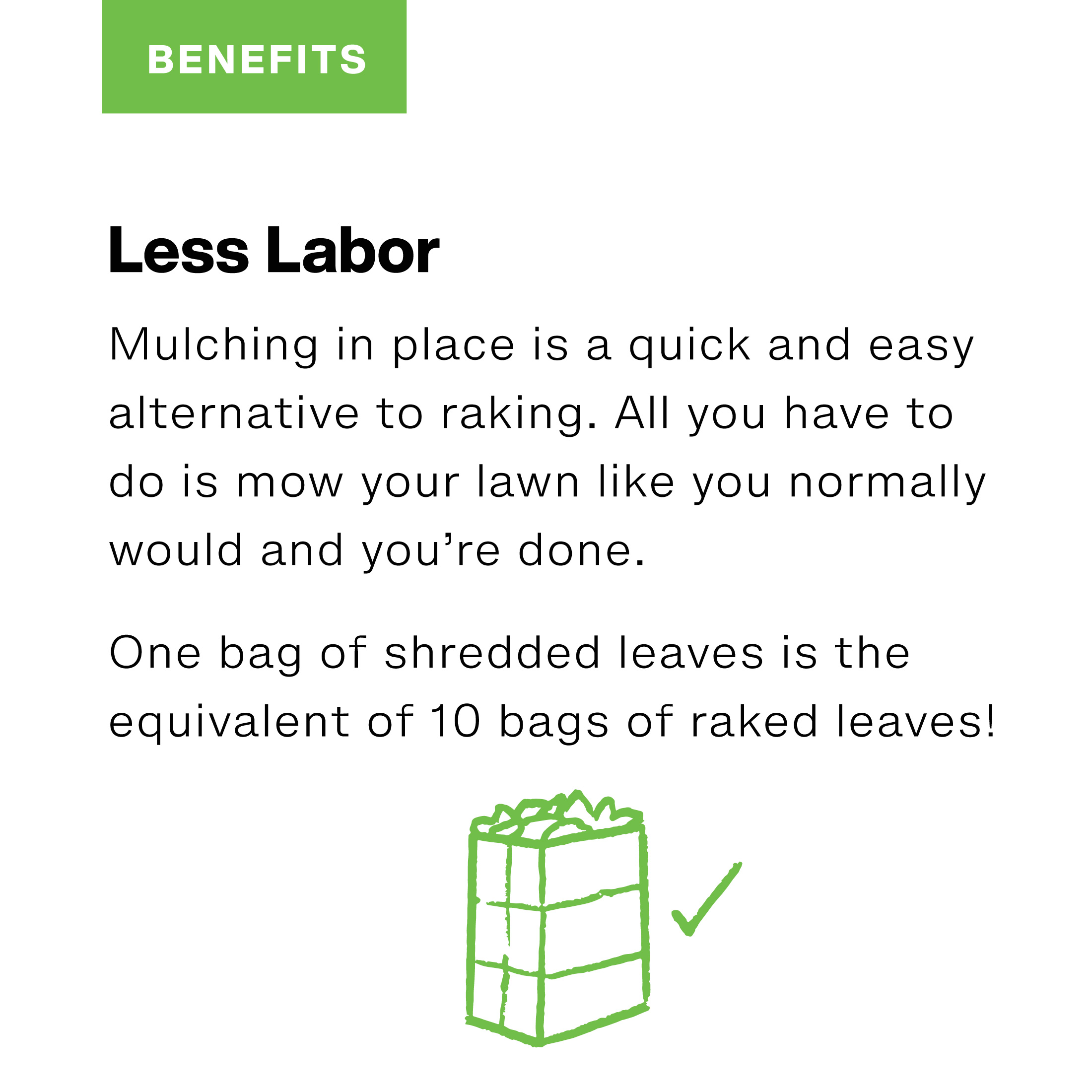 Not only do you save money, but you also save time by not having to worry about time-consuming leaf cleanup. Just mow your lawn as you normally would, and you’re good to go. (Did you know that one bag of shredded leaves is equivalent to a whopping 10 bags of raked leaves?