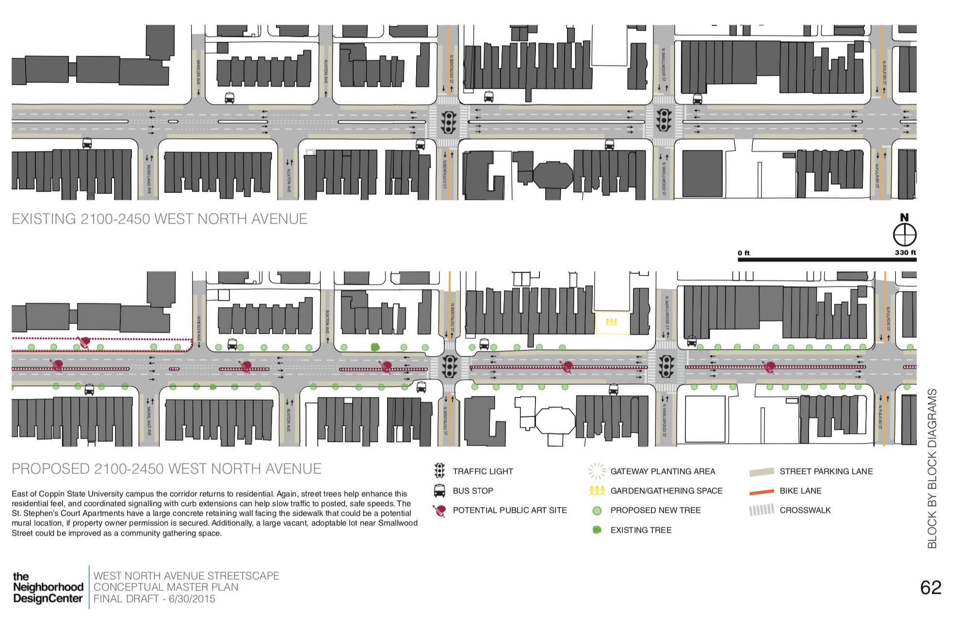 The Neighborhood Design Center facilitated an extensive 18-month process of visioning and design with technical and design expertise provided by its volunteers and with the neighborhood knowledge of core stakeholders. The process attempted to be as inclusionary as possible, with numerous opportunities and means for engagement with area residents and other community organizations. The West North Avenue Streetscape Conceptual Master Plan c NDC recruited volunteer professionals with expertise in urban planning, architecture, transportation planning, landscape architecture, community engagement, civil engineering, marketing, and graphic design to serve as resources for the stakeholder groups.