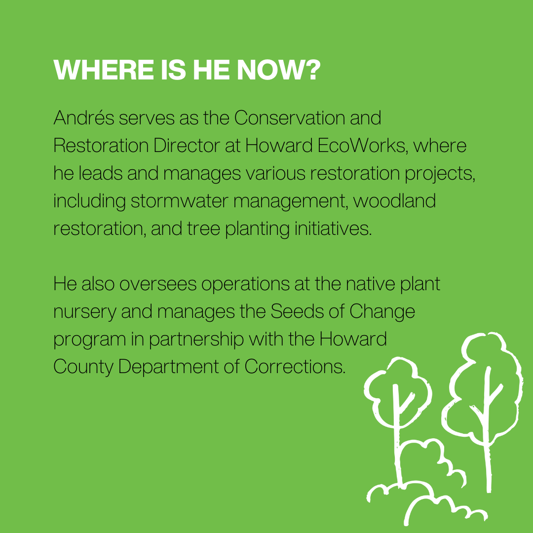 Currently, I serve as the Conservation and Restoration Director at Howard EcoWorks. I primarily lead and manage various restoration projects, including stormwater management, woodland restoration, and tree planting initiatives. Additionally, I oversee operations at the native plant nursery and manage the Seeds of Change program in partnership with the Howard County Department of Corrections. As part of my role, I also conduct tree health assessments.