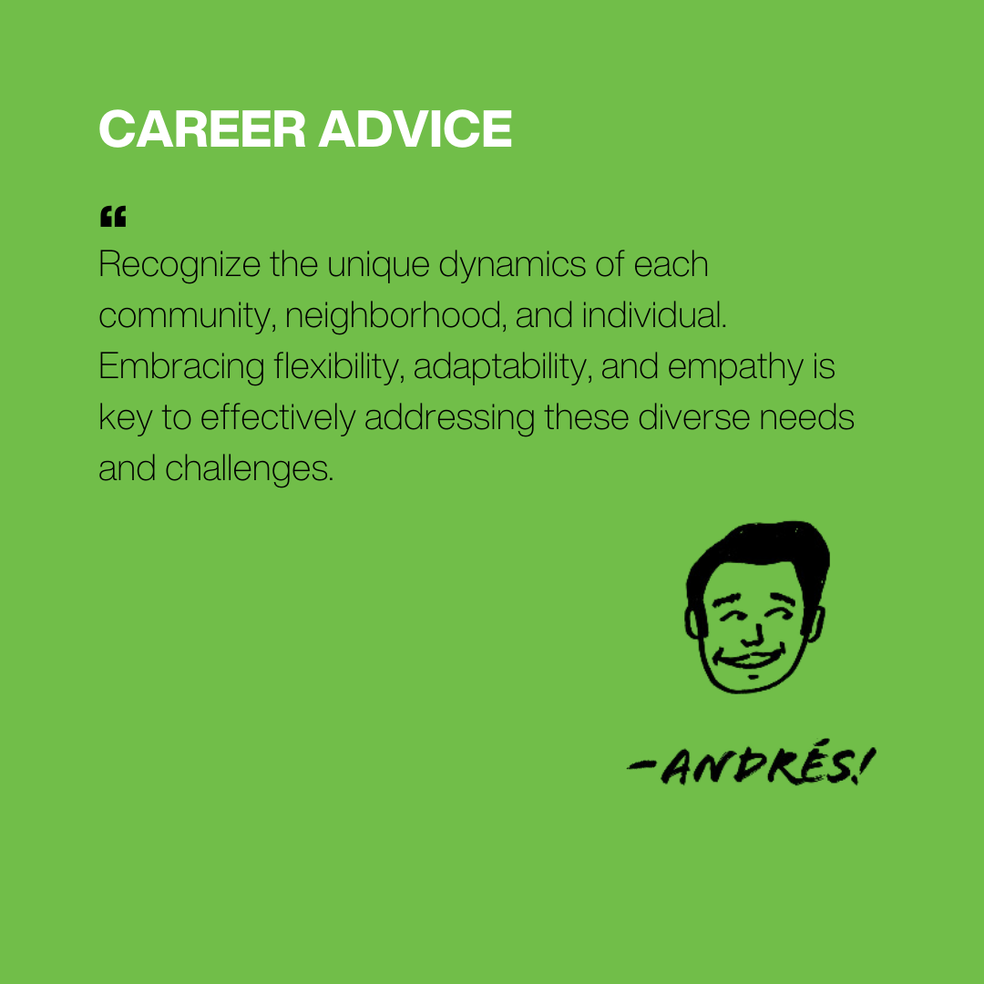 Reflecting on my career journey, I advise aspiring professionals entering the space to recognize the unique dynamics of each community, neighborhood, and individual. Embracing flexibility, adaptability, and empathy is key to effectively addressing these diverse needs and challenges.