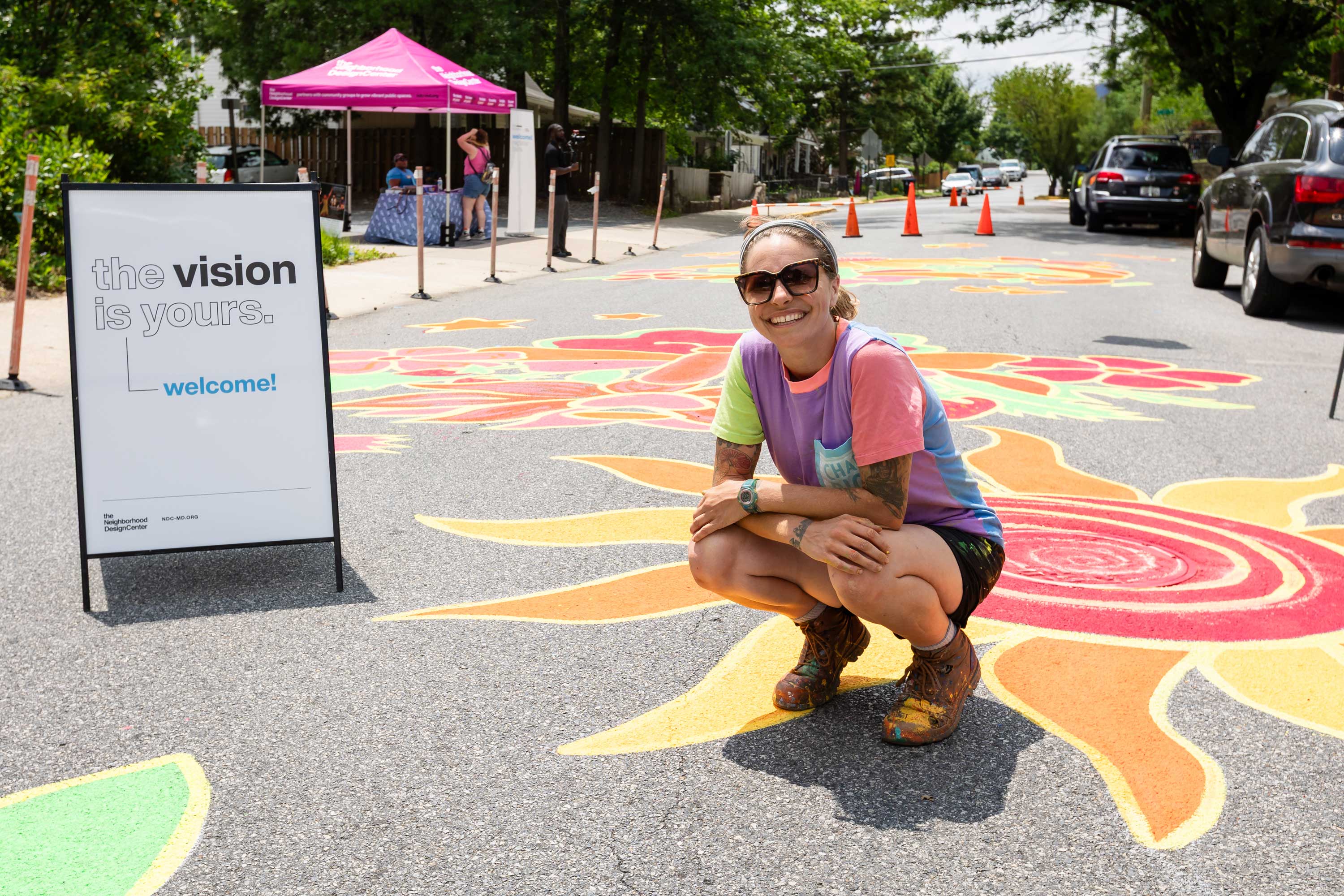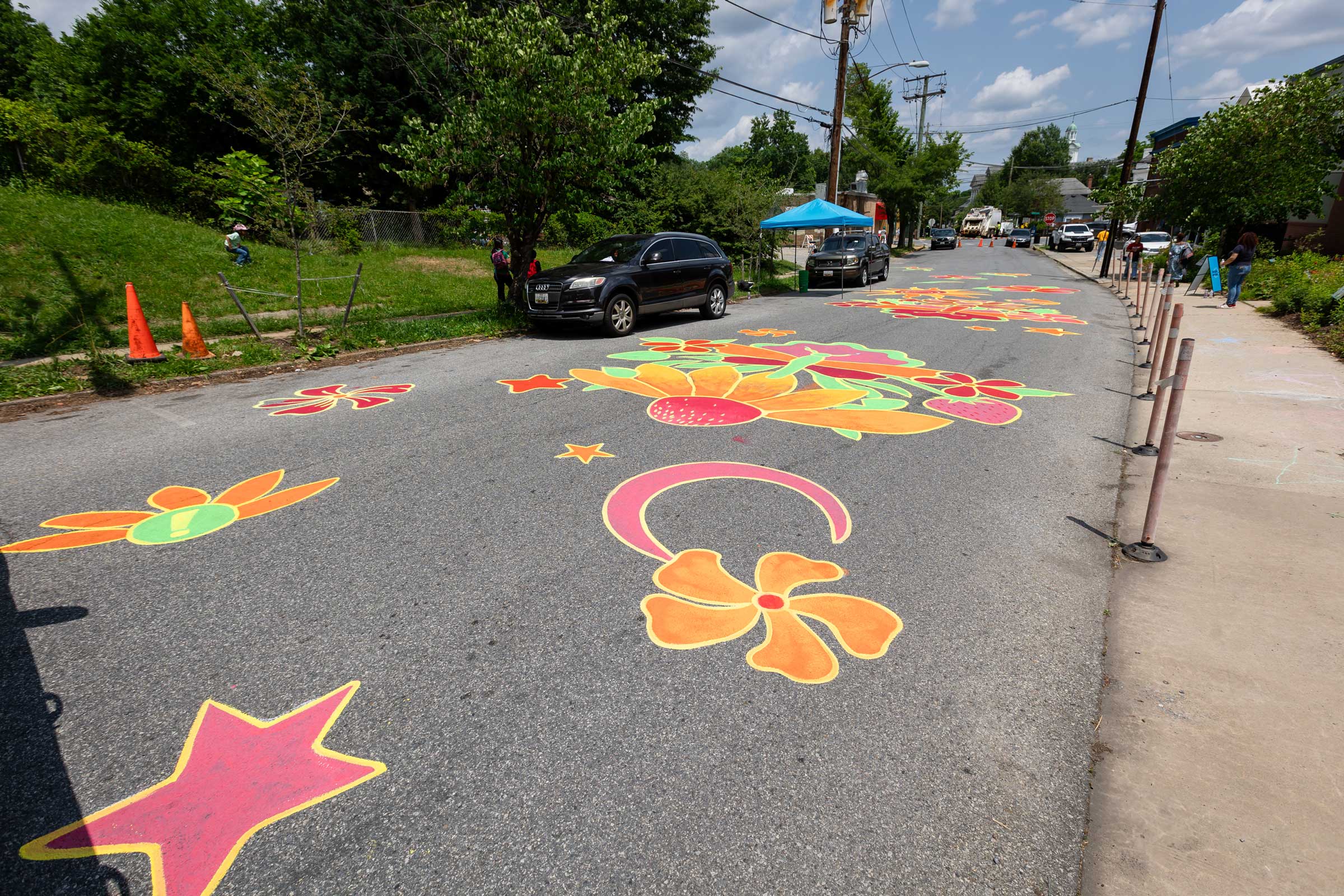 In Fall 2024, with support from the Maryland State Arts Council (MSAC), Prince George’s Arts & Humanities Council (PGAHC), and Anacostia Trails Heritage Area (ATHA), Chalk Riot installed the permanent Bunker Hill traffic-calming mural. The final artwork draws inspiration from the native plantings outside Joe’s Movement Emporium and reflects the themes developed during community workshops and refined through the demonstration.