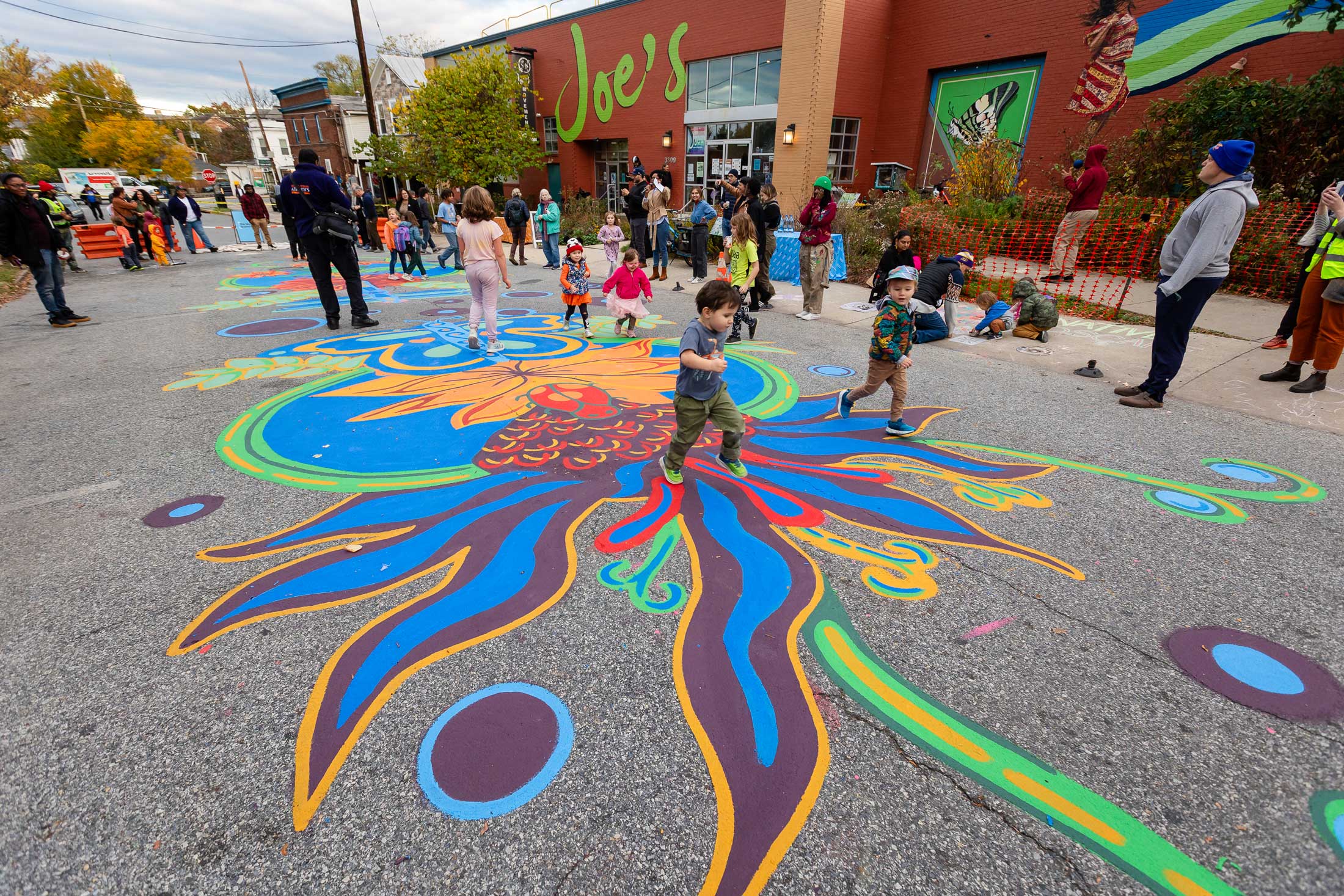 The traffic-calming mural was well-received—it felt approachable and created excitement. It also helped build momentum for bigger improvements, like a new and improved sidewalk. More than that, it started to change how people experience the space. Instead of just feeling like a street for cars, it began to feel more like a place for people—almost like a public art zone outside Joe’s.