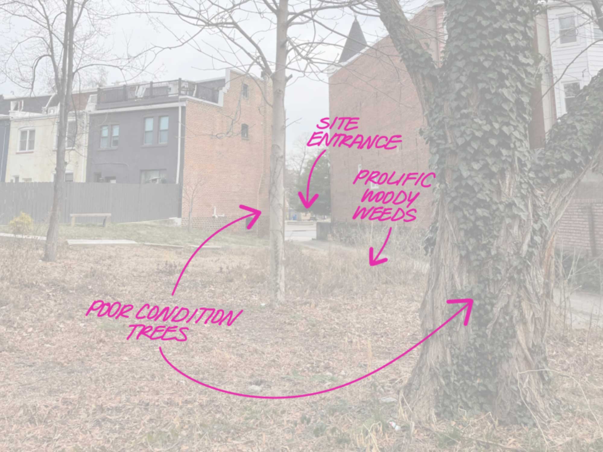 Our design seeks to preserve the space as a habitat for native and edible plants, pollinators, and wildlife, maintain a small selection of community garden beds, and include walking paths and open gathering space underneath a full tree canopy for neighbors.
