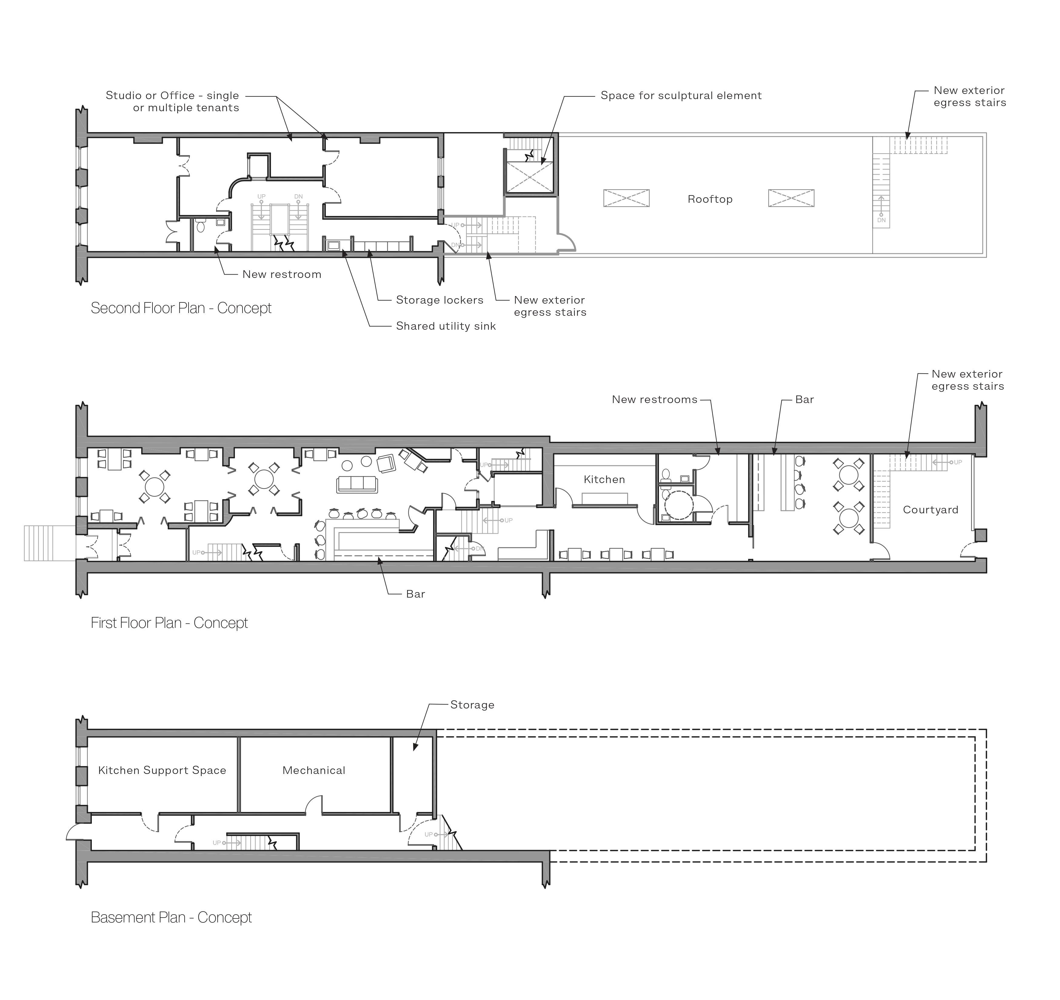One main design element required by the building code is a new stairwell for egress. The concept also includes pulling back the rear wall to allow for a courtyard.